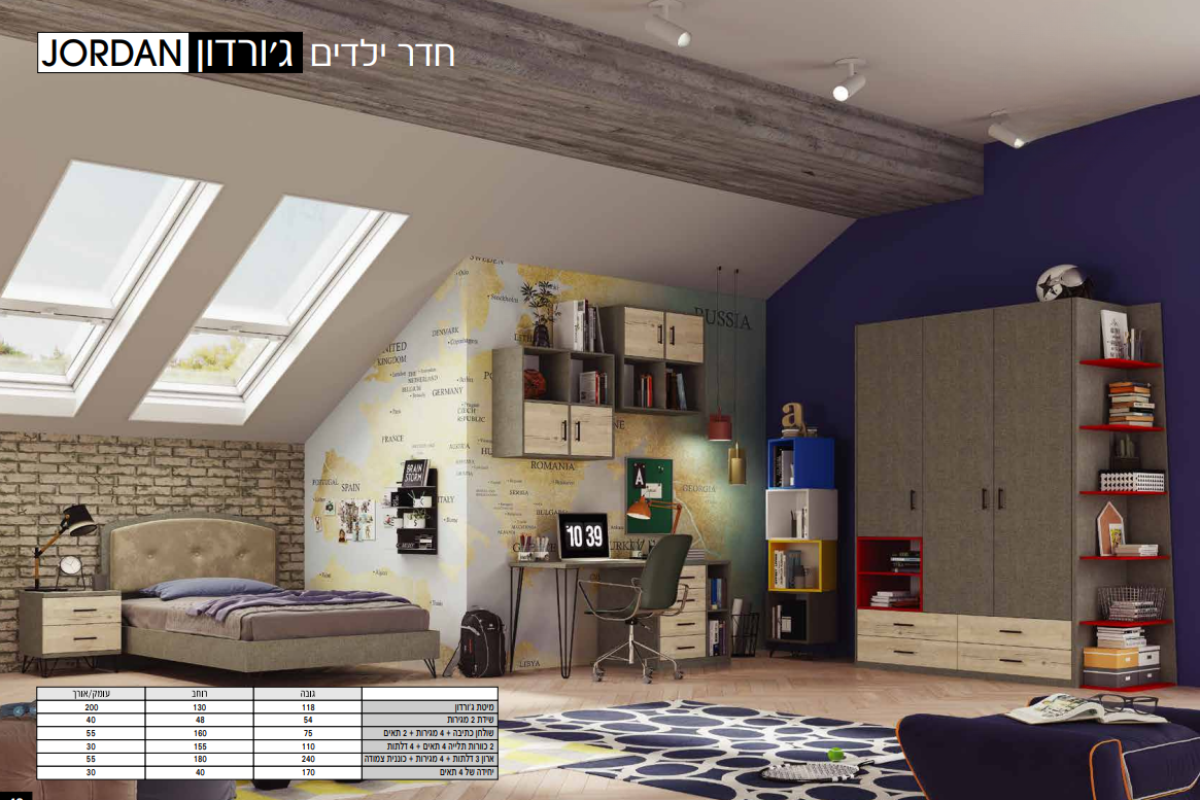 מיטה, שולחן כתיבה + 4 מגירות + 2 תאים, 2 כוורות תלייה, ארון 3 דלתות + 4 מגירות, יחידה של 4 תאים, שידת 2 מגירות.