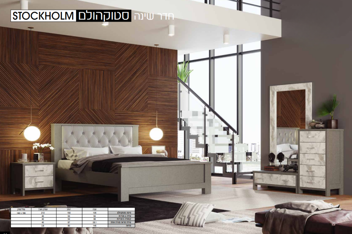 חדר השינה כולל: מיטה סטוקהולם: גובה: 105 ס"מ, רוחב: 150 ס"מ, עומק: 213 ס"מ, גודל מזרן: 190X140. שידת מראה מגירה אחת: גובה: 28.1 ס"מ, רוחב: 87 ס"מ, עומק: 40 ס"מ. שידה 2 מגירות: גובה: 50 ס"מ, רוחב: 53 ס"מ, עומק: 40 ס"מ. מראה: גובה: 145 ס"מ, רוחב: 80 ס"מ, עומק: 2.8 ס"מ. קומודה 5 מגירות: גובה: 98 ס"מ, רוחב: 53 ס"מ, עומק: 40 ס"מ.